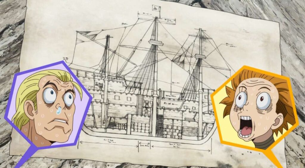 ゲンの提案によって皆で作る船のアイデア勝負をすることになり、マグマ、陽、千空の三人で船のアイデア勝負を行います。結局、三人の中で千空が考えた船の設計図が全会一致で採用されます。