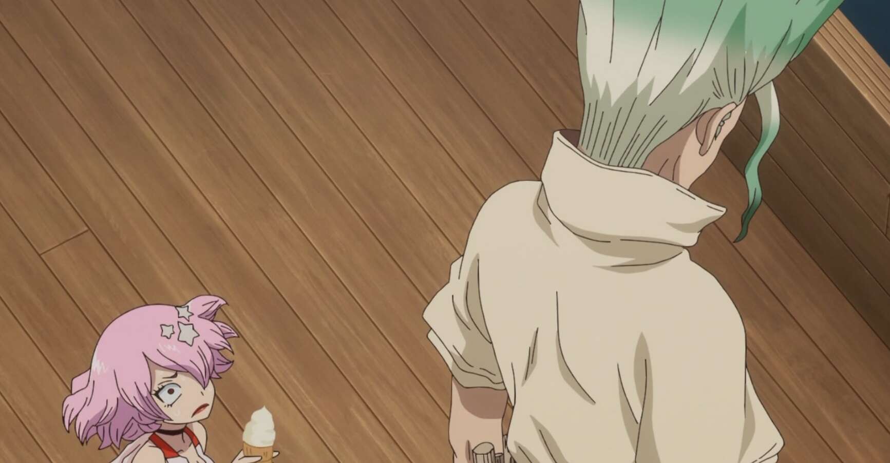 ドクター大樹を暗殺しようとするスタンリーは、ルーナをスパイとして送り込み、大樹を特定し甲板に誘い出し、合図を送るように命令します。スタンリーは哨戒機で下見しておいた狙撃ポイントで合図が来るまで待ち、狙撃銃で大樹を暗殺しようと企みます。ルーナはすぐにドクター大樹を特定しますが、自分の合図で人が殺されることに躊躇してしまいます。そんなルーナに千空はソフトクリームを振舞い懐柔しようとしますが、ルーナの言葉からドクターゼノの正体が明らかになります。
