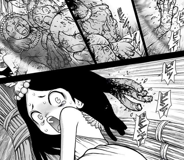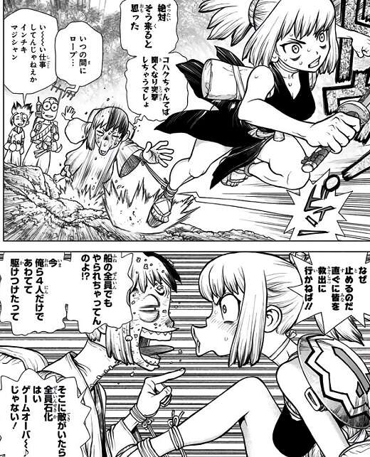 ゲンとソユーズが望遠鏡で機帆船ペルセウスを確認すると、船員が全員石化されている光景が見えてました。怒ったコハクはすぐに機帆船ペルセウスに乗り込もうとしますが、敵の正体も分からず、ゲンに止められます。ソユーズは赤ん坊の頃の記憶を思い出し、ヒトを石化する何かから逃げてきたと、千空達に伝えます。