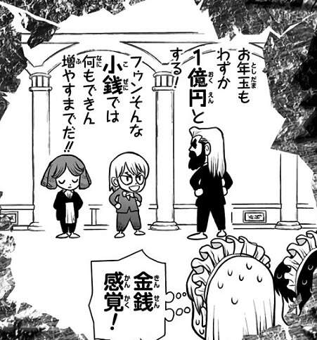 七海 龍水の金銭感覚が分かる場面です。さすが七海財閥の御曹司だけあって、1億円のお年玉を小銭と言ってのけています。父親と執事のフランソワ以外、全員引いています。