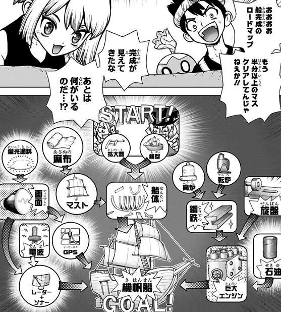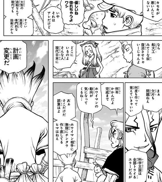 クロムが発見した鉄鉱石の鉱山に、物流網を敷いてさらには舗装道路も整備したことで、鉄も大量に手に入ります。しかし、大型船の建造はカセキの腕でも無理があり、どんどん船体が歪んでしまい最終的に行き詰ってしまいます。千空は大型船建造を諦め、定員数名の小型のヨット建造に切り替える決断をします。