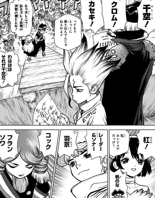 ついに機帆船ペルセウスが竣工し、石化の謎を解く『世界冒険チーム』が結成されようとします。龍水が独断で選んだ乗船メンバーが発表され、続々と機帆船ペルセウスへと乗船していきます。しかし、危険な旅が予想されるため、中には『人類発展チーム』として本土に残りたいと希望する者も現れます。