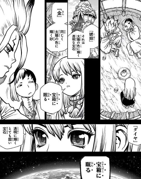 千空は、全人類70億人、全員を助け出す……!!!と言い出し、まずは復活液を無限に作り出すため、宝島の宝箱を目指すことに決定します。ルリから百物語を聞いていた千空は、百物語の内容から宝島の宝箱に千空の父親達が希少な鉱石を遺してくれたと推測します。
