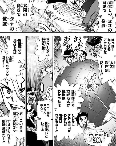 大圏航路ルートを進む千空達は日本に残ったルリ達と連絡を取り合い、時間と太陽の高さを利用して人力GPSから現在位置を特定します。現在の場所が分かっている間は、アメリカ行きの航海も順風満帆でしたが、雨天が続き太陽の位置が分からなくなると、現在位置も正確に測れなくなり航海に支障が出てき始めます。