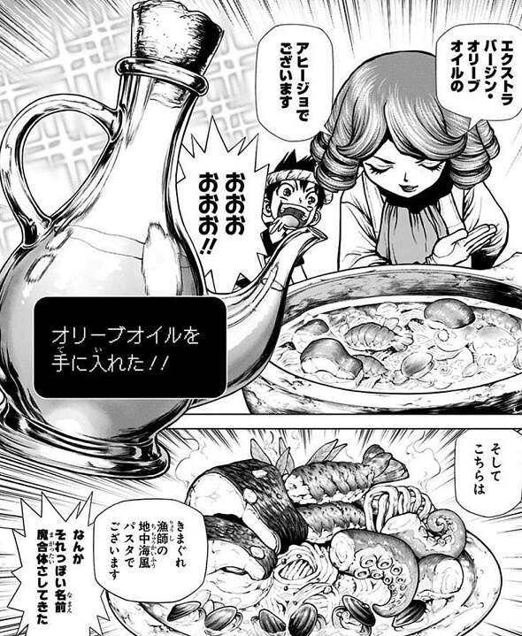 宇宙船や宇宙服を作るため、蛍石を手に入れようと千空達はスペイン・バルセロナに向かいます。大西洋を経由してスペイン・バルセロナに到着しますが、龍水とフランソワは蛍石よりも、まずはオリーブオイルを欲しがり、さっそくオリーブの木からオリーブの採集しようとします。そしてオリーブオイルを使い、アヒージョ等のスペイン料理を全員に振舞います。