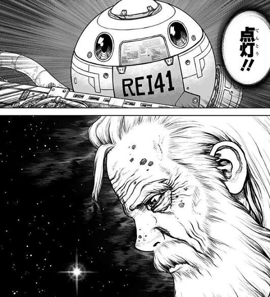 しかし百夜は3人を諦めず、ISSに残っている全ての燃料を使ってISS自体を動かし、さらに当初の九十九里浜でなく3人が着陸した近くの島を目標地点にします。これで息子 千空に会うことは難しくなりますが、それでも百夜達は3人を助けに地球に帰還します。人間が全員地球に帰還した後、ISSにはロボット レイだけが残り、戻ってくることのない百夜をレイは待ち続けます。