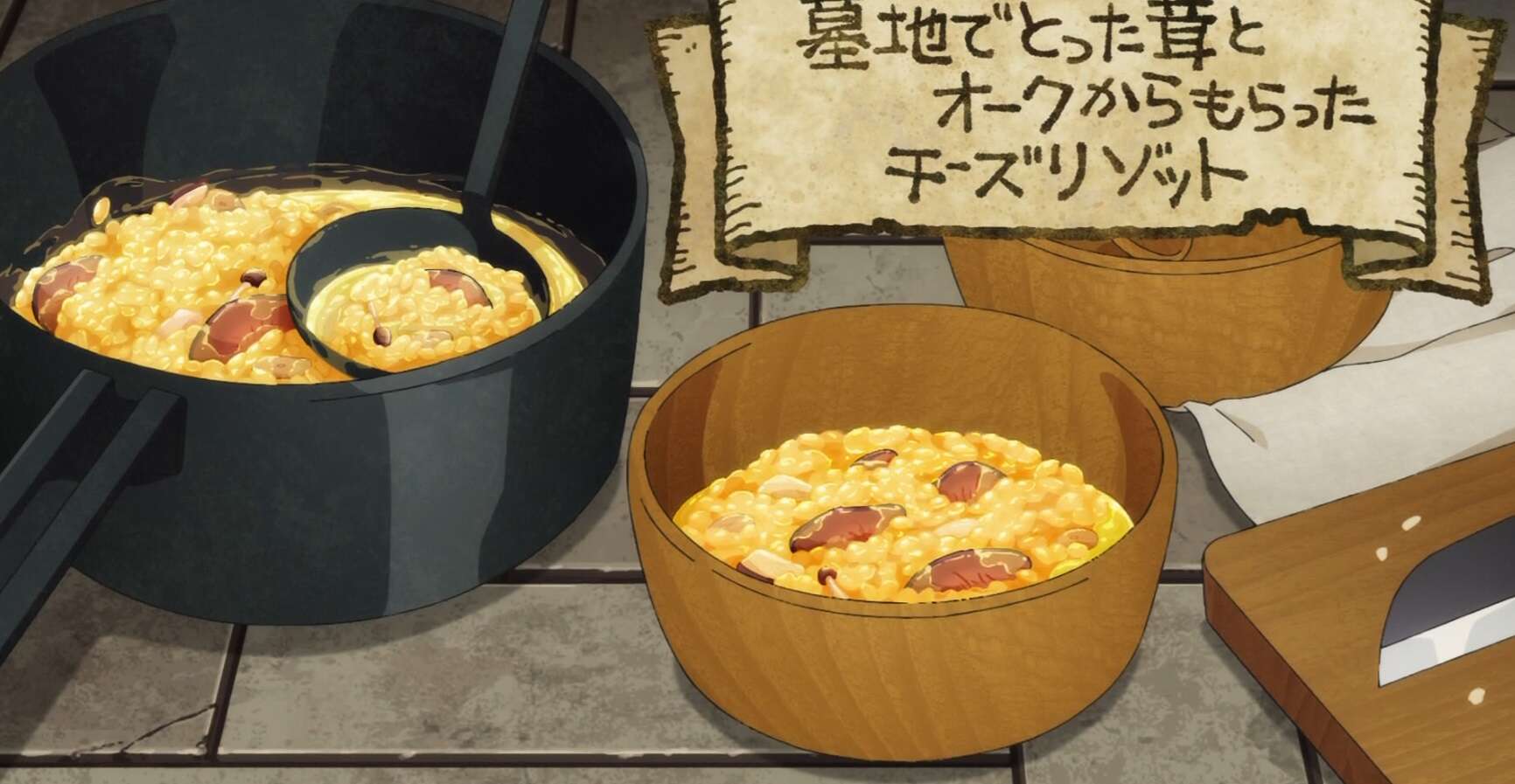 魔物を食わせたら殺すとアセビに言われ、センシは魔物を食材として使わず、茸を具にしようとしますが、茸には足のような物が生えかけていました。しかし、センシは多分気のせいと言うと見なかったことにして、茸を切って米とバター、にんにくで炒めて、さらにチーズを加えて茸とチーズリゾットを完成させます。
