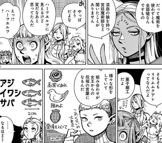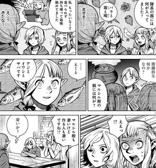 マルシルはパッタドルの話の内容から、リリクムムアレがどんな料理なのか一生懸命想像し、闇鍋的なものだと推測します。そしてパッタドルにはエビ、タコ、玉ねぎ、ミスルンにはバラ、苺、鳩が配られたと聞き、自分にはアジ、イワシ、サバが配られたと嘘をつきます。それを聞きパッタドルはかなり驚き、マルシルは凄いと思わず言います。