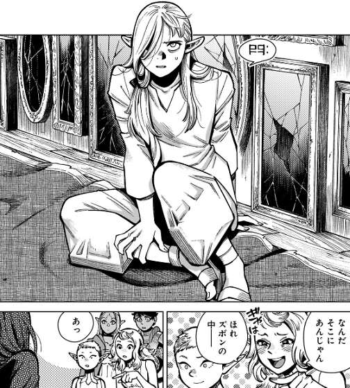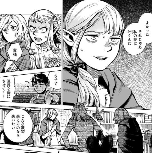 しかし本は見つからず、ミスルンはマルシルを問い詰めます。マルシルは名前を知らないエルフが本を知っていることに驚き、とっさにミスルンを魔法で攻撃します。
