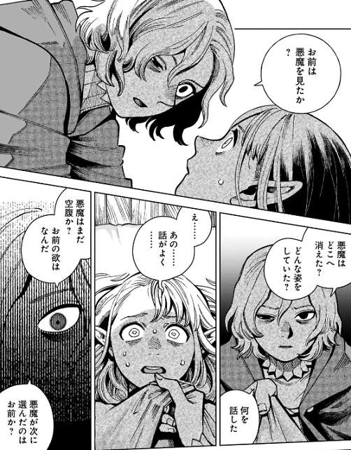 本を強引に探そうとするミスルンとマルシルはもみ合いになりますが、パッタドルがミスルンをマルシルから引きはがします。するとマルシルが何か術を唱えていることにフレキが気付き、さらにマルシルのズボンの中に本があることに気付きます。気付いた時には、マルシルは既に本の封印を解いていて翼獅子 = 悪魔が姿を現します。
