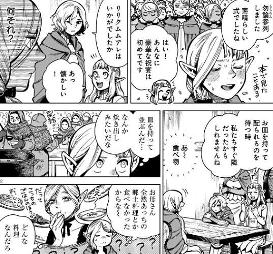 ミスルンは女王の即位20年を祝う記念式典で会ったことがあるかも、と言うと、マルシルは本で見たことがあるようで、式典に参列してもいないのに参加していたことにして、ミスルンの話に合わせます。すると、式典で出たリリクムムアレの話になります。どうやら食べ物のようで、リリクムムアレはお皿を持って配られるのを待つもののようです。何も知らないマルシルは当然頭の中では、何それ?とハテナが付いています。