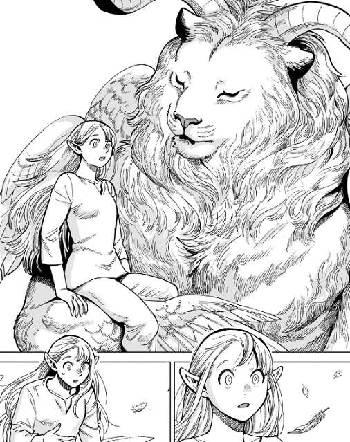 ライオス達と合流した後、ファリンを冷凍保存して、マルシルが一旦落ち着ける場所を作ろう、と今後の話をしながら移動しますが、マルシルは色んな感覚が頭の中に流れ込んでくる状態に慣れません。迷宮内の状態やシスルが配置した“目”達の視点の情報のようで、今は切っておくかい、と翼獅子は言います。そんなことできるの?とマルシルが言うと、翼獅子は切ってみせて、マルシルは少し楽になることが出来ます。