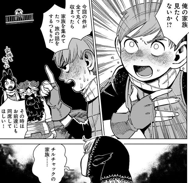 チルチャックは、マルシルに自分の家族に会わせると約束します。チルチャックは、今回の件が収まったら、家族に旅の話をするが、その時にはお前達にも同席してほしい、と恥ずかしがりながらも言います。チルチャックの家族にすごく興味のあるマルシルは、その話に食いつきます。