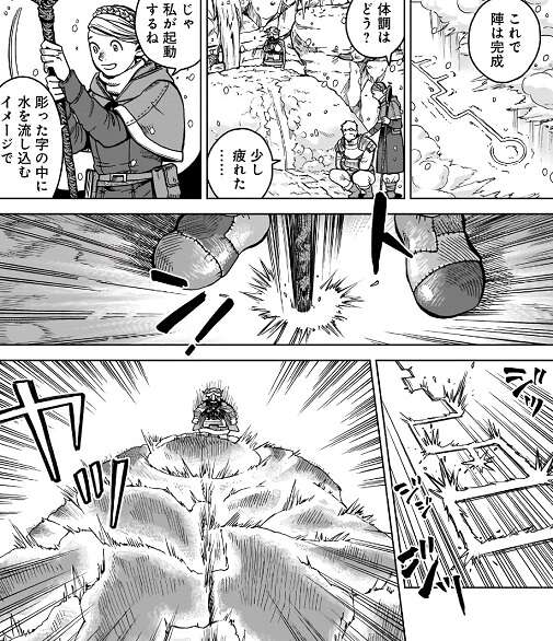 センシは氷漬けになった魚を食材にしようと、マルシルに魚の部分のみを切り出して欲しいと頼みます。マルシルはいい機会だからと、ライオスに魔法陣の描き方を教えて描いてもらいます。無事ライオスに魔法陣を描いてもらい、マルシルが魔法陣を起動して魚を取り出そうとしますが、魔法陣を起動した途端アイスゴーレムが現れます。