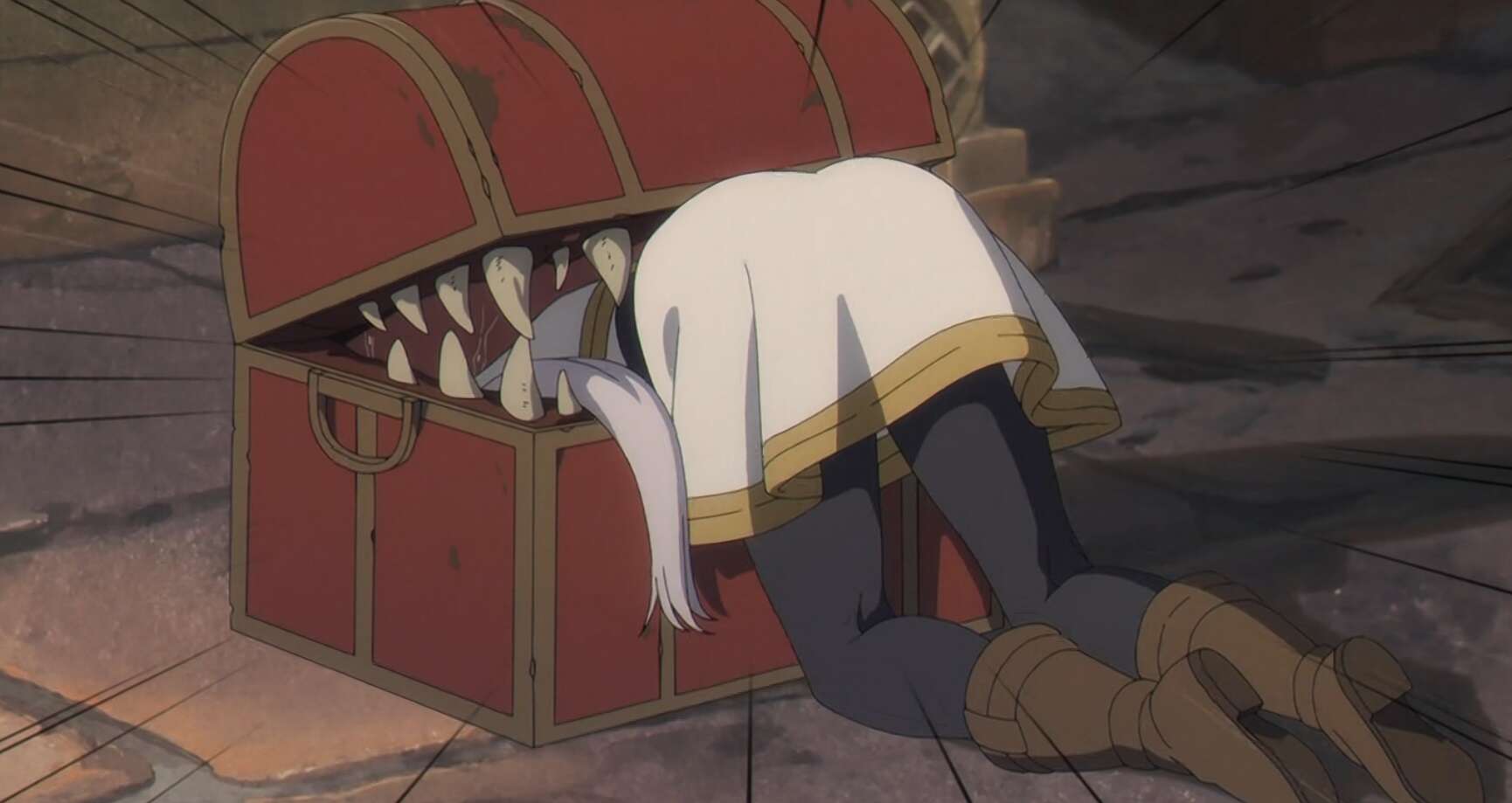 フリーレンは宝箱を見付けて、この魔力…魔導書かも、と宝箱を開けようとします。しかしフェルンから、宝箱を判別する魔法(ミークハイト)の結果はミミックだと言って宝箱を開けないように注意されます。しかし、ミークハイトの魔法の精度は99%だとフリーレンは言い、残りの1%を見破った偉大な魔法使い達がいたからこそ、歴史的な発見があったんだ、と言うと、フリーレンは迷わず宝箱を開けます。