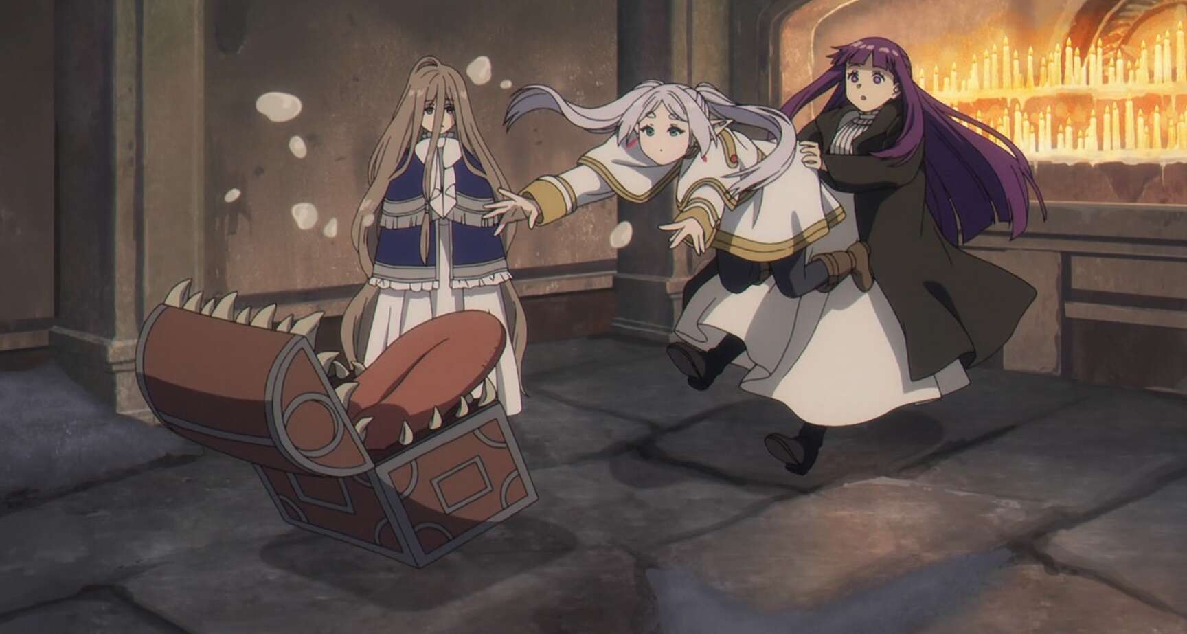 フリーレンにとっても難しいダンジョンですが、そんなことは気にせずダンジョンの中の宝箱を開けてはミミックに引っかかって、フェルンの世話になっています。