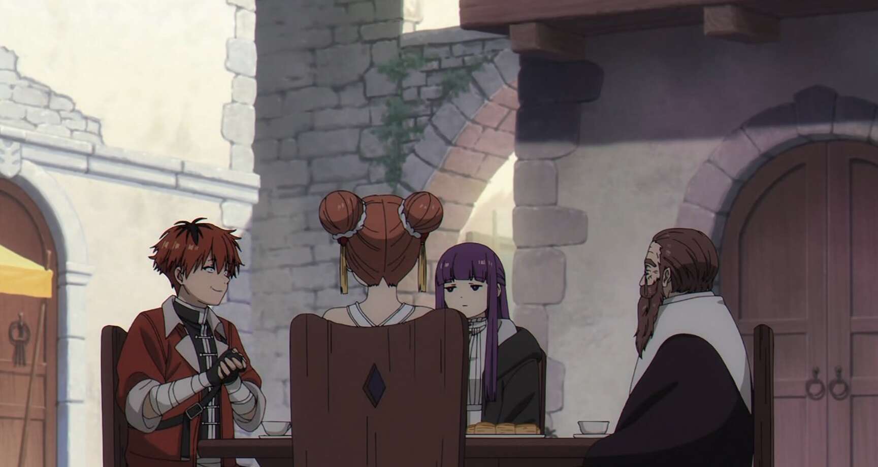 その後、フェルンとシュタルクはオイサーストの街中で、甘いお菓子を食べようとしていると、偶然デンケンとラオフェンに出会います。フェルンとシュタルクは、デンケンにお茶やお菓子をおごってもらいますが、シュタルクはデンケンが宮廷魔導士と分かり驚き、タメ口叩いてすいませんでした、と謝ります。フェルン達にお菓子を勧めながら、デンケンは二十半ばで先立たれた妻の話や、勇者一行のフリーレンに憧れて魔法使いになった話をフェルンにいます。