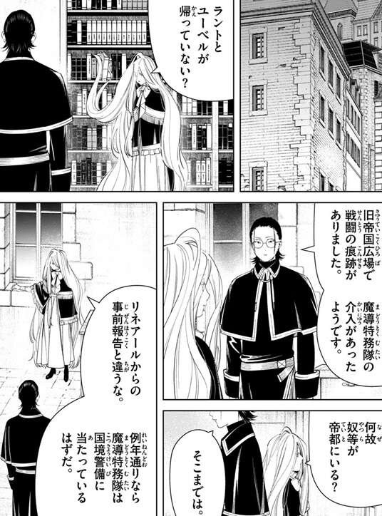 前回、ラントとユーベルは魔導特務隊に拘束されてしまいましたが、ゼンゼとファルシュの所にはラントとユーベルが行方不明という情報が届きます。さらに、旧帝国広場で戦闘の痕跡があった事や魔導特務隊の介入があった事から、ラントとユーベルは魔導特務隊に身柄を拘束された可能性が高いとゼンゼは推測します。リネアールの報告では、例年なら魔導特務隊は国境警備に当たっているはずで、建国際という国事があるからこそ内地に兵力を割けず、魔導特務隊は国境警備から動けないはずでした。