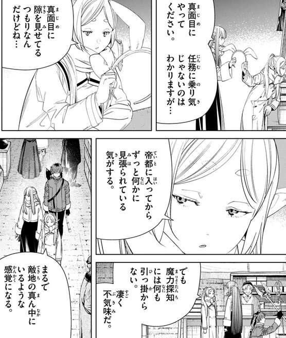 フェルンが、見回り中だと言いましたよね、と言い真面目にやるように言いますが、フリーレンは真面目に隙を見せてるつもりと答えます。帝都に入ってからずっと何かに見張られている気がする、と言い、すごく不気味で敵地の真ん中にいるような感覚になるとフリーレンは警戒します。