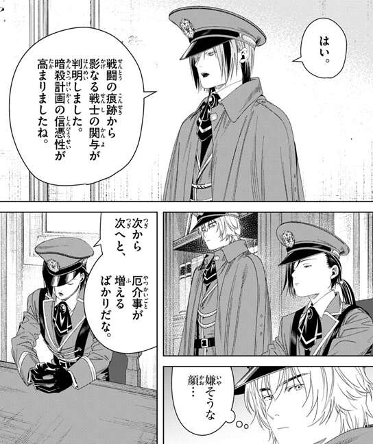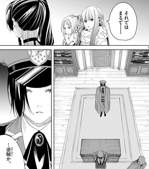 私だったら正義感に燃えちゃうかなー、間違った方向に進む帝国を救わなきゃって、とユーベルは言い、フェルンがそれではまるで、と言った所で、場面は魔導特務隊がいる部屋へと移ります。カノーネは、…逆賊か、とつぶやきます。