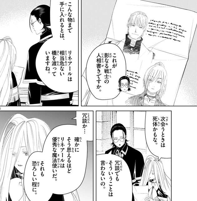 ゼンゼとフリーレン達の会話にファルシュも加わり、リネアールから入手した影なる戦士の人相書きを確認しています。人相書きにはシュリットやクレマティスが描かれていて、ファルシュはリネアールが相当危ない橋を渡っていると推測します。ゼンゼも、次会ったときは死体かもな、と言いますが、ファルシュは冗談でもそういうことは言わないの、とゼンゼに注意します。