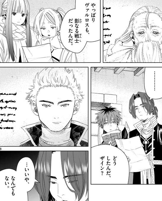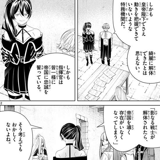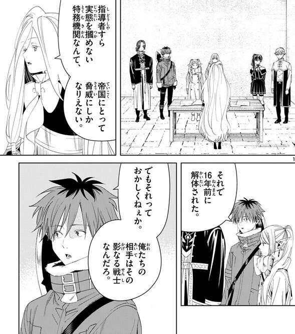 一方、リネアールが収集した情報が書かれた文章を確認したゼンゼは、敵の正体が影なる戦士だと確認します。影なる戦士は暗殺に特化した帝国の特務機関で、帝国の正規の組織だからフリーレンは相当まずいと言います。下手をすれば帝国そのものを敵に回すことになる、慎重に動くべきだとラントは言いますが、フェルンが影なる戦士を既に一人ぶっ飛ばしちゃったけどね、とフリーレンがぼそっとつぶやきます。さらにユーベルとラントは魔導特務隊と派手にやり合っているので、帝国への印象はかなり悪いかもしれません。しかし、ゼンゼは影なる戦士は16年前に先代の皇帝陛下の勅命によって解体されているので、正規の組織と決まったわけではないと言います。解体の理由は指揮系統が不明だからで、影なる戦士は通常の軍隊とは真逆で、現場の指揮官に大きな権限が与えれた組織だったようです。上の命令無しに各指揮官が勝手に動く軍隊だったようで、フェルンはなんでそんな仕組みになっているか疑問を口にしますが、フリーレンは強いからでしょとそんな仕組みになった理由を推測します。