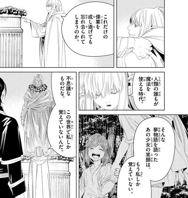 ゼーリエは帝都を歩いていると、大魔法使いフランメの像を見つけます。しかしこのフランメの像も本物の面影は残っておらず、ゼーリエはこれだけの偉業を成し遂げても、人々から忘れ去られてしまうのか、と複雑そうな表情をします。フランメが少女だった頃の笑顔は、もうゼーリエしか覚えていない状況に不思議なものだな、とゼーリエはつぶやきます。