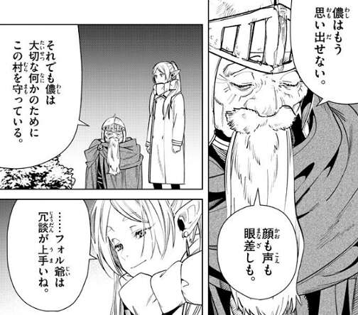 切っ掛けという言葉にフォル爺さんは、儂はもう思い出せない、顔も声も眼差しも、それでも儂は大切な何かのためにこの村を守っている、と妻の事を思い出せないと告白します。それを聞いたフリーレンは、……フォル爺は冗談が上手いね、と微笑みながら返事をします。