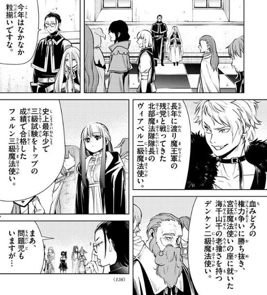 そして二か月後、一級魔法使い選抜試験が行われます。会場の端で試験官と思われる人物が参加者を見ています。今年は粒揃いの参加者のようで、史上最年少で三級試験をトップ成績で合格した魔法使いとして、フェルンも注目されているようです。