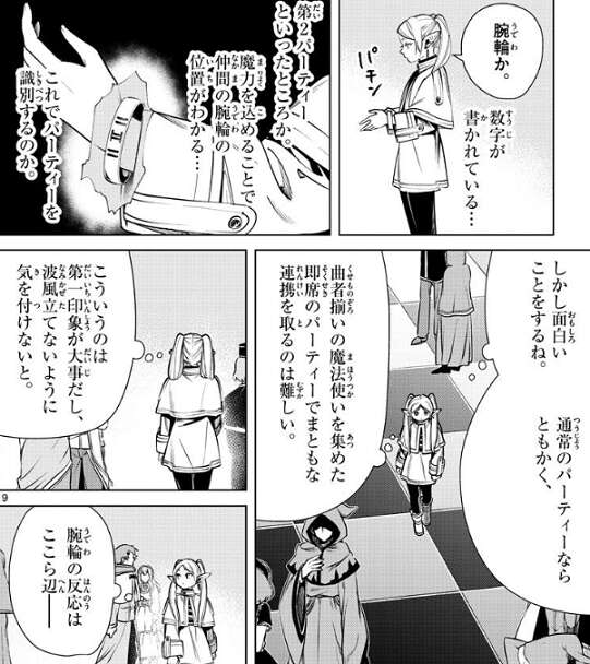 そして試験官のゲナウから一次試験の内容が発表され、一次試験はパーティー戦だと知らされます。総勢57名が、三人一組のパーティーに分かれ試験を受けることになります。組み分けが行われ、腕輪が配られます。腕輪には数字が書かれていて、フリーレンは第2パーティーのようです。仲間の腕輪の位置も分かるようでフリーレンは同じ第2パーティーの魔法使いを探します。
