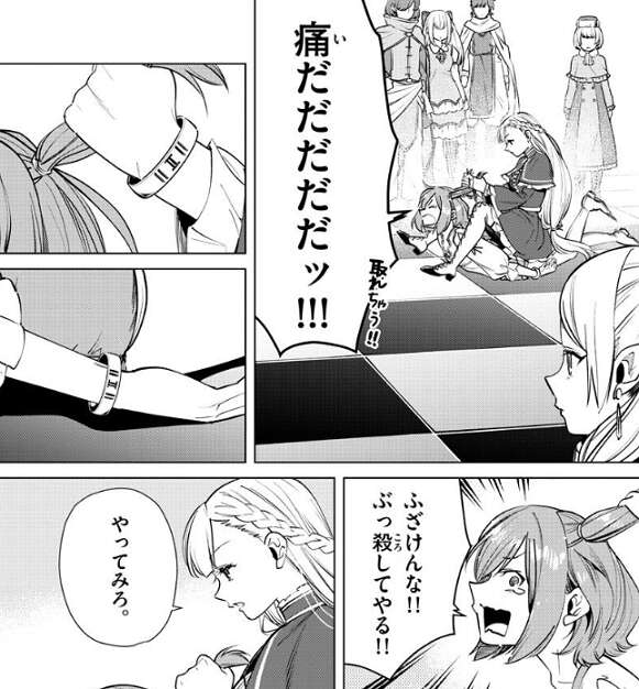 第一印象が大事だし、波風立てないように気を付けようとフリーレンが考えていると、二人の少女が喧嘩をしているのを見つけます。腕輪からフリーレンと同じ第2パーティーのようですが、もう喧嘩してる…、とフリーレンがあきれています。