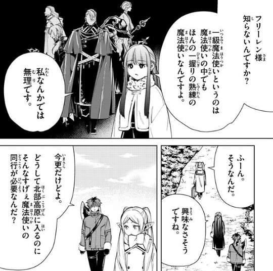 しかし、一級魔法使いというのは魔法使いの中でもほんの一握りの熟練の魔法使いだと言い、フェルンは自分では無理だと言います。シュタルクが、どうして北部高原に入るのにそんなすげぇ魔法使いの同行が必要なのかと質問すると、昔から北部高原は幻影鬼(アインザーム)みたいな狡猾な魔法を使う魔物が多いから、僧侶と魔法使いがいないと超えられない難所だと、フリーレンが答えます。とはいえ通行に貴重な熟練の魔法使いを要求するのは、北部高原では相当厄介なことが起こっているんだろうね、とフリーレンは言います。