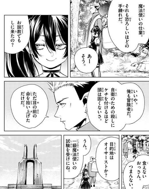 クラフトが盗賊達を追い払うと、魔法使いはユーベルと名乗り、お礼を言います。しかし、クラフトはユーベルが人殺しの目をしていると言い、お前を助けたわけではないと言います。近くの森に切り刻まれた盗賊の死体があった、魔法使いの仕業で恐ろしいほどの手練れがやったものだとクラフトが言うと、ユーベルはお説教でもしに来たの?と、つまらなそうに答えます。自衛のための殺しにケチを付けるほど頭は固くないさ、ただ目の前の命を拾い上げただけだ、とクラフトが答えると、食えないおっさん、つまんない、とユーベルはつぶやきます。ユーベルの目的地はオイサーストで一級魔法使いの試験を受けに来たと聞いたクラフトは、フリーレンの事を思い出し次会った時の土産話が楽しみだ、と言います。