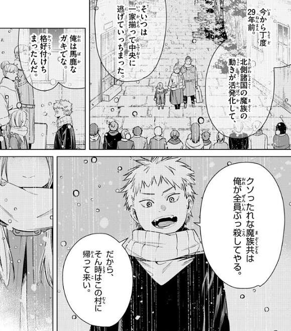 そして、今から丁度29年前、一家揃って中央に逃げて行った好きだった女の子に、ヴィアベルは格好付けて、クソったれな魔族共は俺が全員ぶっ殺してやる、だから、そん時はこの村に帰って来い、と言った事が魔族と戦う理由だとエールに話します。