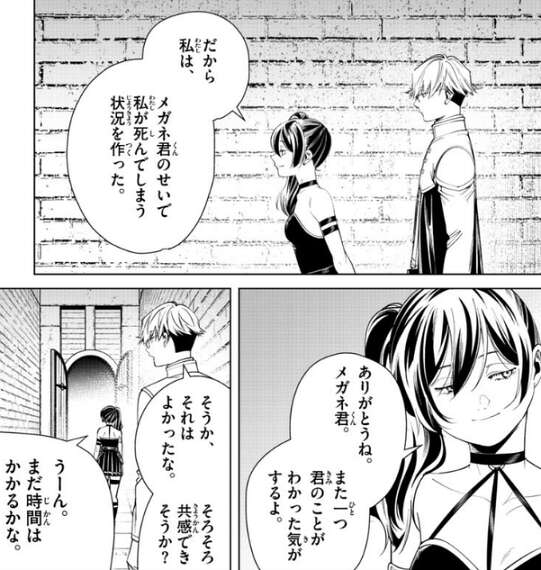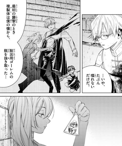 さらに複製体が追い詰めたのに追撃してこないのは、ユーベルの見た者を拘束する魔法(ソルガニール)を警戒しているからだ、とラントは言いユーベルの複製体はユーベルに対する知識もあると推測します。ラントの出血量を見てこのままでは長くないよ、とユーベルは言うと、最後に今のラントは本物なのか聞きます。ラントは答えをはぐらかすとユーベルは自分の脱出用のゴーレムの瓶を、ラントに渡します。
