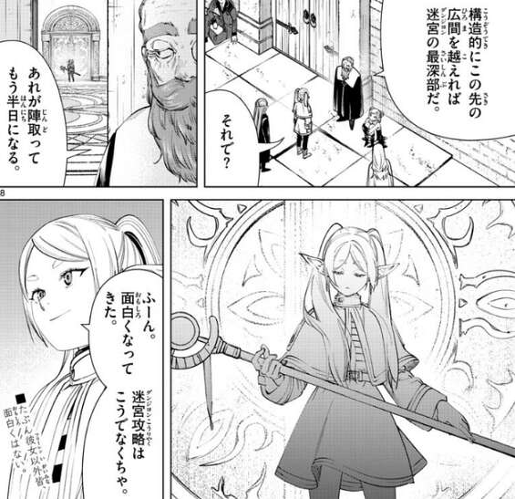 フリーレン達も迷宮の最深部の手前まで辿り着きますが、デンケンのチームは扉の前で座り込んでいました。フリーレンが、どうしたの、こんな所に集まって?と、聞くと、デンケンはあれが陣取ってもう半日になる、とフリーレンの複製体に半日の間、手も足も出せていなかった状況を説明します。その状況を聞いて、迷宮攻略はこうでなくちゃ、とフリーレンはやる気を出します。