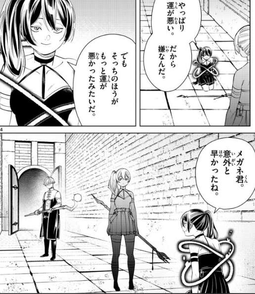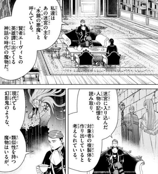 試験官のゲナウが部屋で話をしている場面となり、複製体の話をしています。あの複製体は迷宮の主で、ゲナウ達は“水鏡の悪魔(シユピーゲル)”と呼んでいるそうです。迷宮に入り込んだ人物の記憶を読み取り、対象者の複製体を作り出しているようです。水鏡の悪魔(シユピーゲル)が作り出すのは実体を持った、実力も魔力も技術さえも模倣した完璧な複製体で、この複製体のせいで零落の王墓は未だ未踏破のようです。複製体は自分と互角の相手で、犠牲を出さずに倒すには冷静な自己分析とチームワークが必要となる、実に平和主義者のゼンゼらしい試験内容だ、とゲナウは言います。