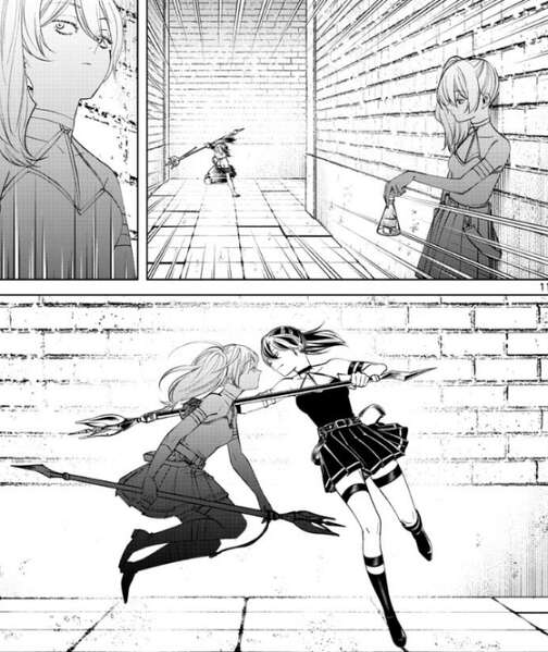 ユーベルがラントに、あの複製体がどの程度まで完璧にコピーしているか、意見を求めます。ユーベルは戦いの最中でも饒舌ですが、ユーベルの複製体の方は物静かで、ユーベルは記憶や人格まではコピーしていないってことかな、と推測します。しかしラントはたぶん複製体が喋れないだけだ、と言い、最初の襲撃のとき複製体はラントの懐から脱出用のゴーレムの瓶を抜き取っていました。それを聞いたユーベルは、確かに私ならそうする、と納得します。
