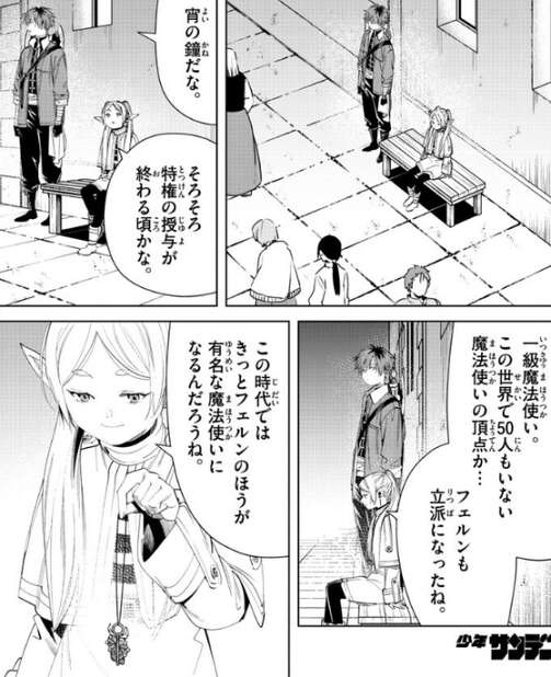 フリーレンとシュタルクが外で待っていると、宵の鐘が鳴りそろそろ特権の授与が終わる頃です。フリーレンは、世界で50人もいない一級魔法使いにフェルンもなり、フェルンも立派になったね、と言います。この時代ではきっとフェルンの方が有名な魔法使いになるんだろうね、とフリーレンは聖杖の証を眺めながら言います。そしてフリーレンは、嬉しいね、と喜ぶと、シュタルクも、そうだな、と返事をします。そこに大陸魔法協会のレルネンがフリーレンに会いに、一人でやって来ます。