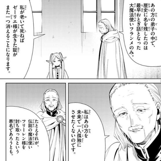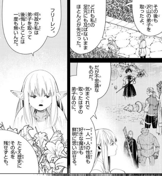 ゼーリエとの面接で、ゼーリエの部屋にあった花畑は、フランメが好きだった魔法で作られた花畑だとフリーレンは言います。そしてフリーレンは、ゼーリエはフランメの魔法をくだらない魔法だと言っていなかったけ?と、聞くと、正直フランメは失敗作だったとゼーリエは言い、あれだけの才を持ちながら私ほどの高みへは辿り着けなかった、とフリーレンに話します。その後も沢山の弟子を取ったが、どれもゼーリエの足元にも及ばないままほとんど先だった、とゼーリエは言いますが、しかし気まぐれで取ったはずの弟子なのに、一人一人の性格も好きな魔法も鮮明に思い出せる、とフリーレンに話します。そして、何故か私は弟子を取って後悔したことは一度も無い、たとえ歴史にその名を残せずとも、とゼーリエはフリーレンに言います。その話をレルネンは黙ってフリーレンから聞いていると、特権の授与が終わったフェルンが戻ってきます。