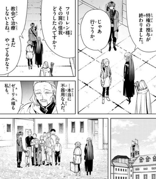 特権の授与が終わりました、とフェルンが戻ってくると、フリーレンは、じゃあ行こうか、と何事もなかったようにフェルンとシュタルクと一緒に歩きだします。フェルンが肩の怪我を気にしますが、教会で治療しないとね、まだやってるかな?と、フリーレンはレルネンの事は一切言いません。その会話風景をレルネンは見ながら、…本当に不器用な人だ、と言いますが、その時にはフリーレンへ攻撃する気は一切なくなっていました。