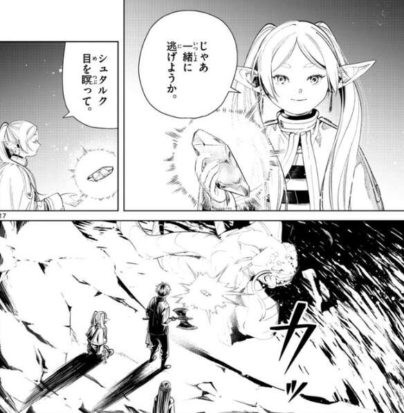 他の出口を探しながらフリーレン達は先を進みますが、フリーレンは、魔法の使えない私達はここではただの女の子だ、と言い、シュタルクに頼りにしていると言います。シュタルクが、女の子…?と、つぶやくと、昔シュタルクがクソババァと言ったことをまだ根に持っているようで、フリーレンはその事を持ち出します。素直にシュタルクは、フリーレンに謝ります。
