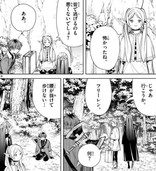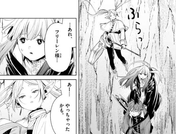 何とか毒極竜から逃げて、洞窟の出口に辿り着いた三人、フリーレンは、皆で逃げるのも悪くないでしょ?と、シュタルクに話しかけます。そして、フリーレンは旅路を続けようとしますが、シュタルクは腰が抜けて歩けないとフリーレンに訴えます。