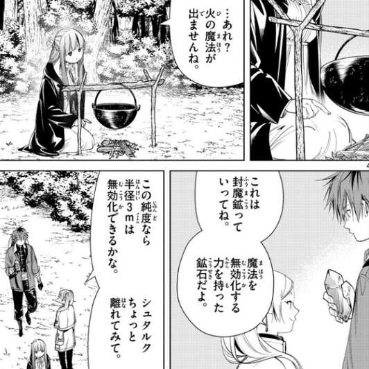 今回から再び、北部高原を目指す旅が始まります。その旅の途中、魔法を無効化する鉱石、封魔鉱を見つけて、フリーレンは封魔鉱で遊びます。しかし、フェルンには不評で早く捨てるように言われてしまいます。
