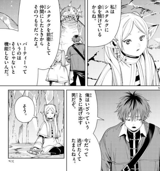 ヒンメルと旅をしていた時の事、何故お前はオレに命を預けるなんて言えるんだ?俺は村を捨てて逃げた男だ、とアイゼンがヒンメルに聞いています。すると、じゃあ逃げたくなったら、皆で逃げよう、僕達はパーティーなんだから、とヒンメルは答えます。その言葉通り、途中でドラゴンに遭遇した時、ヒンメルの勇者一行は、全員で逃げています。そして現在、フリーレン、フェルン、シュタルクの三人も、全員で毒極竜から逃げています。