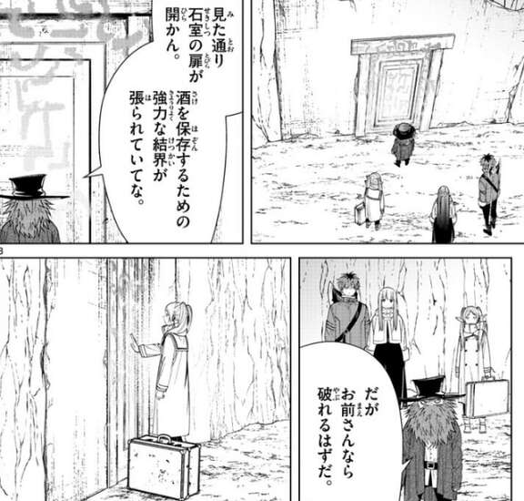 さらに碑文の先には遺跡があり、ファスは遺跡までは辿り着けたと言います。しかし遺跡にある石室の扉には酒を保存するための強力な結界が張られていて、ファスは結界を破れずにいました。ファスは、お前さんなら破れるはずだ、とフリーレンに結界を破るように言いますが、結界の解除には時間が掛かるとフリーレンは無理と言います。