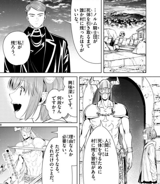 シュタルクがゲナウの所にパンを持っていくと、ゲナウは教会の決壊を張り替えていました。教会の中には村人の死体もあるので、より強力なものに張り替えていました。シュタルクが、なんで死体をそのままにしているんだ?埋葬するなら手伝うぜ、とゲナウに言いますが、北部高原では基本的に村落に墓地はないことを、ゲナウはシュタルクに教えます。結界に守られた貴族の墓以外は、魔物の少ない北部高原南端の共同墓地に埋葬されるようです。北部高原では下手に墓を作ると、腐臭に釣られて魔物が集まってくるようで、地獄のような光景になるので墓は作りません。ノルム商会は随分前から死体を燃やして火葬にするように主張しているようですが、聖職者に反対されているようです。