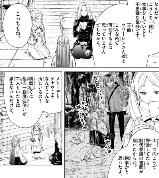 メトーデとフリーレンとフェルンはパンを食べていますが、パンの固さに不満を漏らしています。メトーデはフリーレンとこんな形で再開するとは思っていなかったと言うと、フリーレンも同様にこんな形で再開するとは思っていなかったと言い、その後フリーレンは自分たちが討伐要請の書面を受け取った時の話をします。
