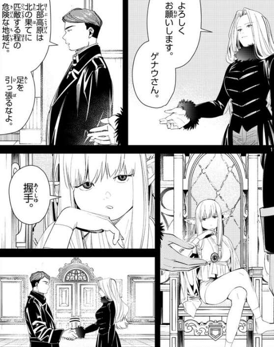 メトーデもゼーリエから討伐依頼を受けた時の話をします。一級魔法使いは基本的にゼーリエの弟子になっているので、ゼーリエからの命令には従わないといけないようです。メトーデはゼーリエからの命令で、ゲナウと二人組で北部高原の魔族の討伐任務をしていました。ゲナウには相棒がいたようですが先日戦死してしまい、そこでメトーデはゲナウの新しい相棒として任務を引き受けました。しかし、ゲナウはメトーデから握手を求められても無視をして、ゼーリエから握手するように言われてやっとメトーデと握手をします。