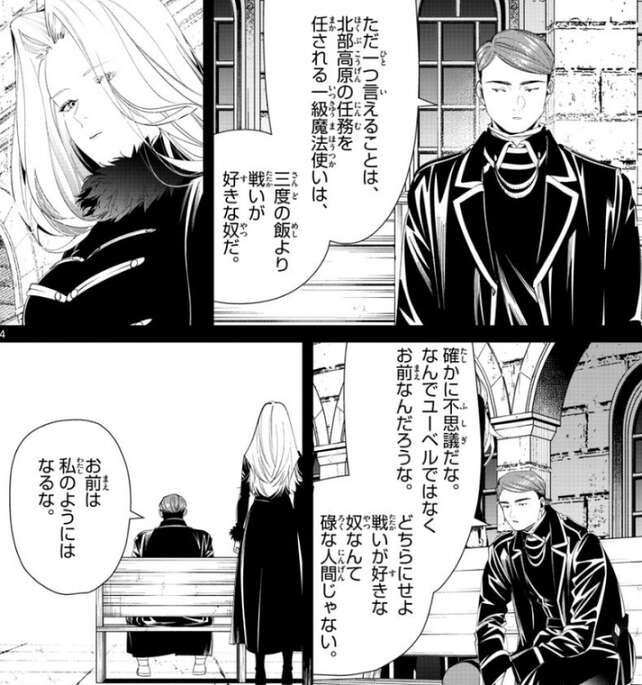 メトーデは何故私がゲナウの相棒になったのか、ゲナウに質問しますが、ゲナウはゼーリエが決めたことだから、私にも分からないと言います。ただ、北部高原の任務を任される一級魔法使いは三度の飯より戦いが好きなやつが多いようで、ユーベルでなくなぜメトーデが選ばれたのか不思議だとゲナウはメトーデに話します。そして最後に、お前は私のようにはなるな、とゲナウはメトーデに忠告します。